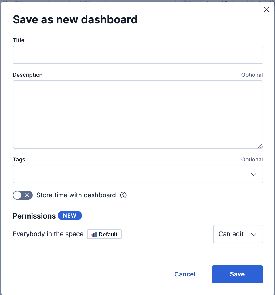 - Can view: Everybody in the space can view the dashboard, but cannot edit or delete it. They can duplicate it. This read-only setting can be changed at any time by the dashboard owner or a Kibana administrator.