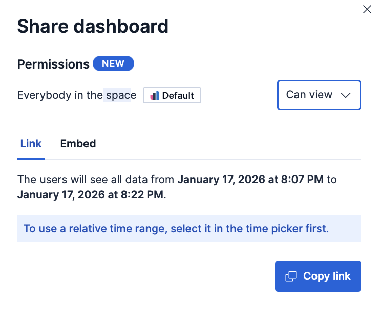 • Can view: Everybody in the space can view the dashboard, but cannot edit or delete it. They can duplicate it. This read-only setting can be changed at any time by the dashboard owner or a Kibana administrator.